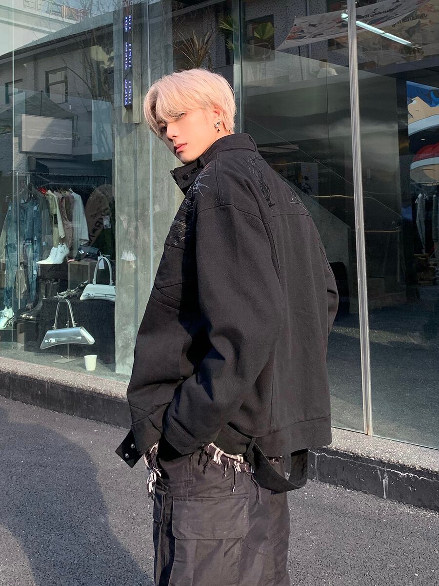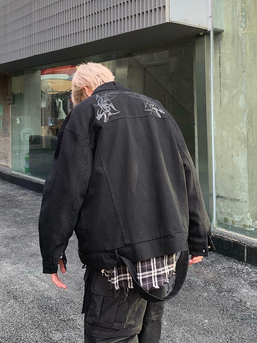 トレンド感満載のブラックデニムジャケット、立ち襟デザインでスタイリッシュな印象をもたらします!