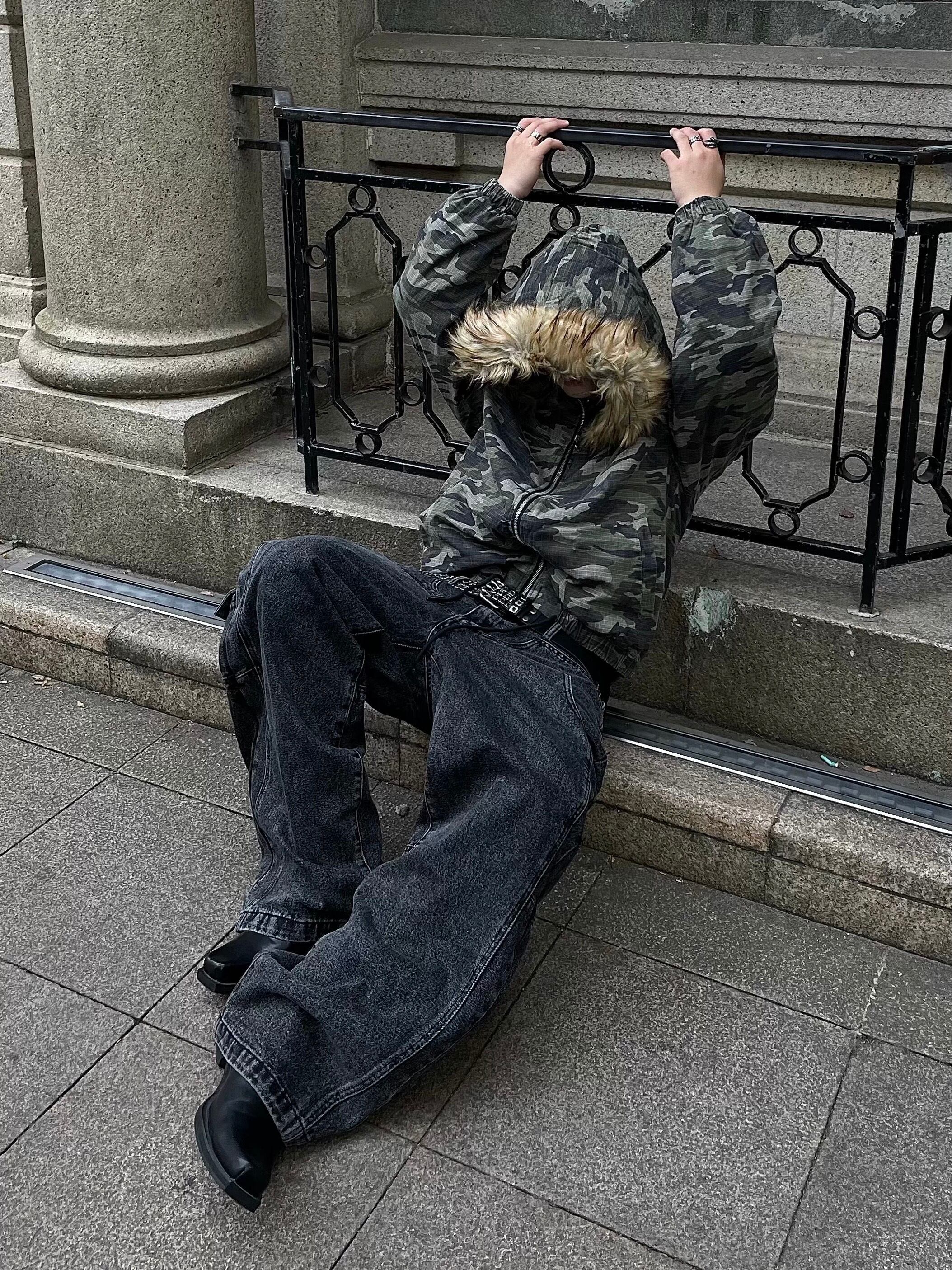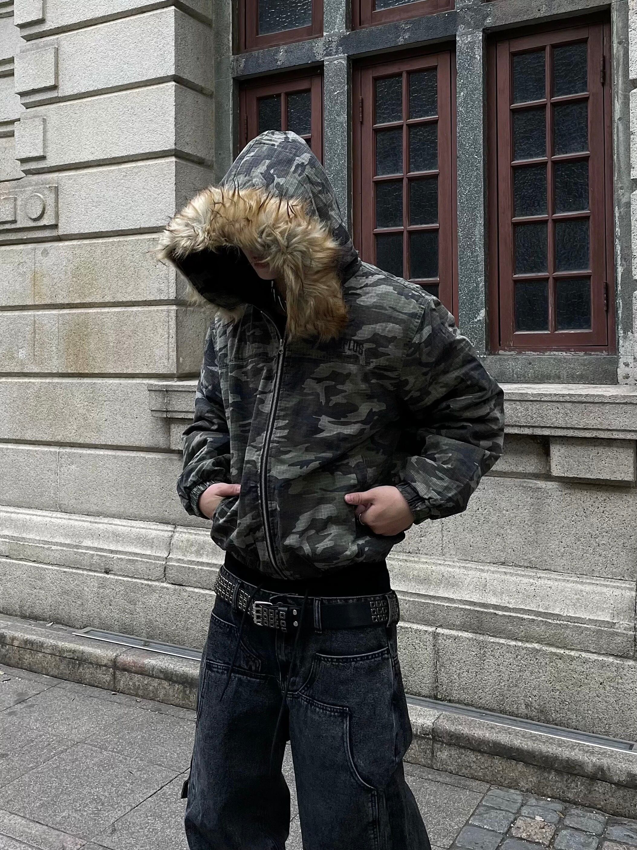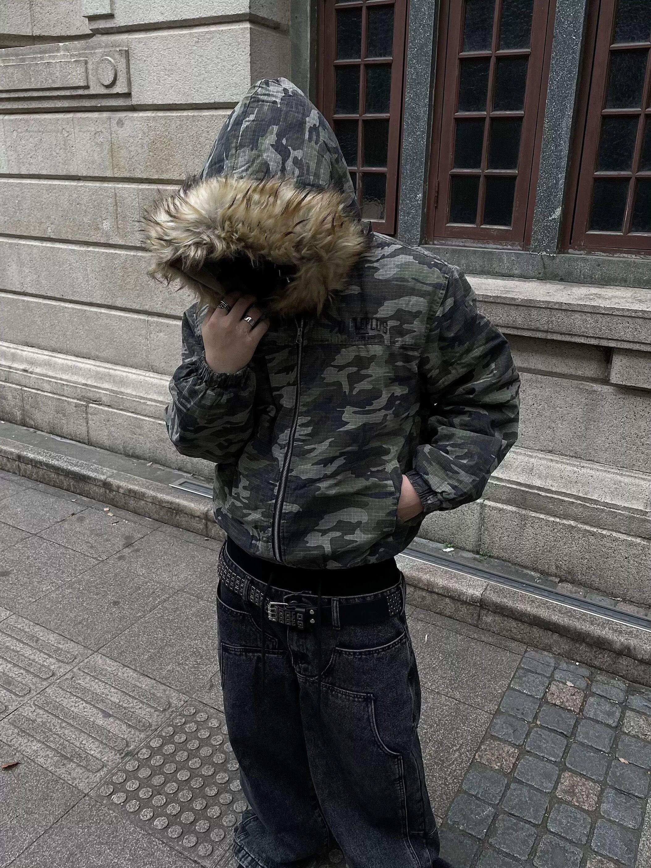 個性的なスタイルを演出するDARK FOGの迷彩ファーフードダウンジャケット!